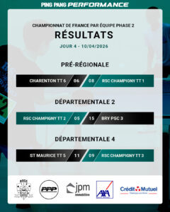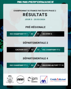 En savoir plus → - NOUVEAU PARTENARIAT ! PING PANG PARISNOUVEAU PARTENARIAT et EQUIPEMENTIER ! Le RSC Champigny Tennis de Table est fier d’annoncer son tout nouveau partenariat avec Ping Pang Paris Cette collaboration marque une belle étape pour notre club : un soutien matériel de qualité des avantages pour … Lire plus…