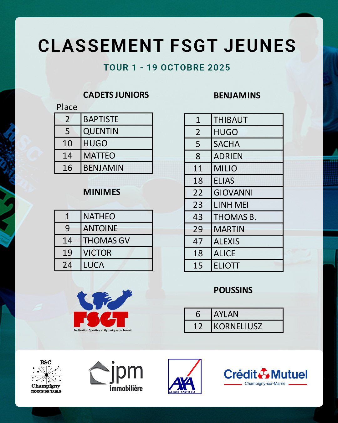 Ce week-end, nos jeunes pongistes ont pu aussi s’illustrer à la table et fièrement représenter le club lors de leur premier tour du tournoi FSGT